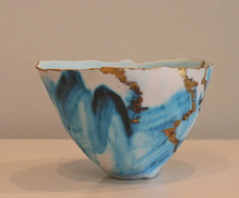 ‘My blue vessels are slip cast porcelain. I pour porcelain slip, liquid clay into a mould and let it soak in irregularly. This is then trimmed and dried. Then bisque fired to 900 celsius. This ware is then painted expressively with copper oxide and glazed over this the glaze and copper combine to create the blues and greens. This is fired to 1170 to 1200 Celsius. I then freely paint a gold lustre on the glaze. The lustre is pure gold about 22 carat or more in a medium. The medium fires away leaving the gold on the glaze. The gold is fired to 700 Celsius. Each stage of the process involves attrition, successes and failures.