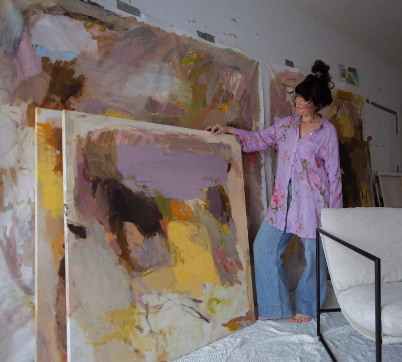 Her pieces combine acrylics & oil pastels to create intuitive abstract pieces with deep undertones, often with velvety forest greens, earthy golds & burnt umber, layered with clay pinks, turquoise & yellow ochre.