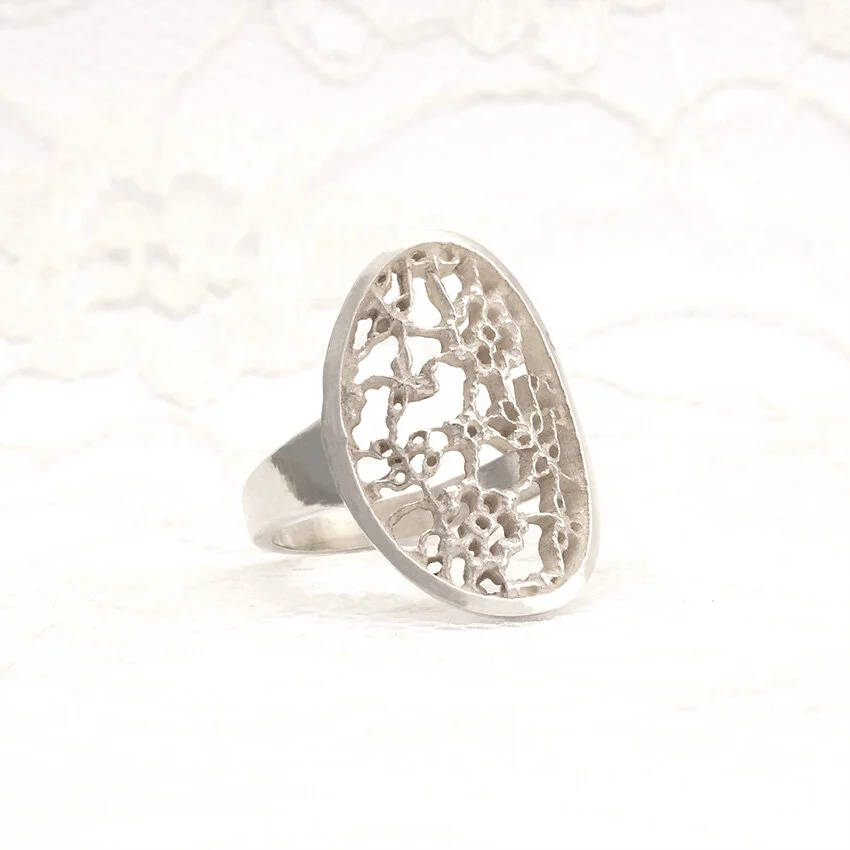 As a contemporary jewellery designer and maker Natalie creates dramatic yet wearable bespoke pieces of work to adorn and decorate the body for both special occasions and everyday life. Trained primarily in metalwork but with an aptitude for fabrics and textile design Natalie combines materials such as lace into design collections that explore pattern, repetition and texture. Much of her work involves a strong focus on rich floral aesthetics and bold colourings. Natalie is inspired by fashion and theatrical costume, old school glamour and burlesque, and she translates her references and research into work that varies in both the processes used to design it and the materials chosen to make it. The result is a broad portfolio of work that includes interesting, delicate, but yet strong statement pieces.